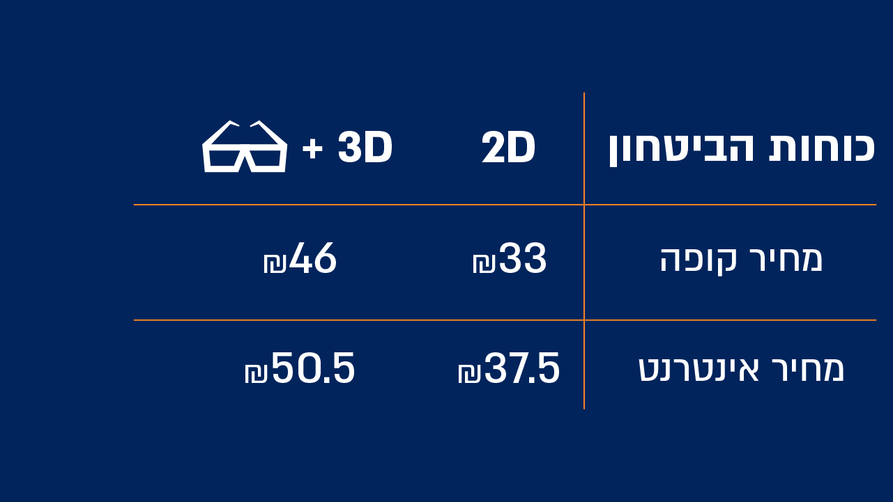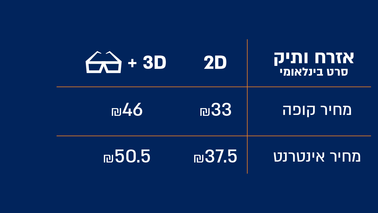 - ההטבה תקפה בכל ימות השבוע, כולל שישי, שבת וחג ולא כוללת אירועים מיוחדים בקולנוע